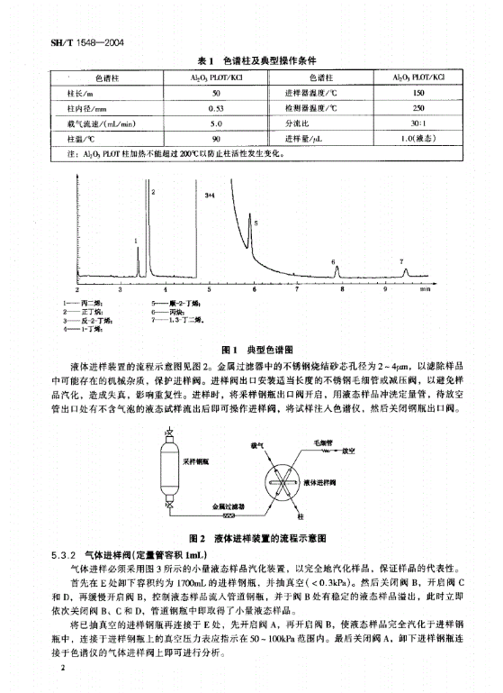 工業用1一丁烯中微量丙二烯及丙炔 | GC5890附有氫火焰檢測器(FID) | 分流比:30:1; 進校量:1.0ul | AL2O3:5.0m*0.53mm | 柱溫:90度; 進校器溫度:150度; 檢測器溫度:250 | 載氣流速:5.0 | AL2O3 PLOT柱加熱不能200度以防止柱活性發生變化 |